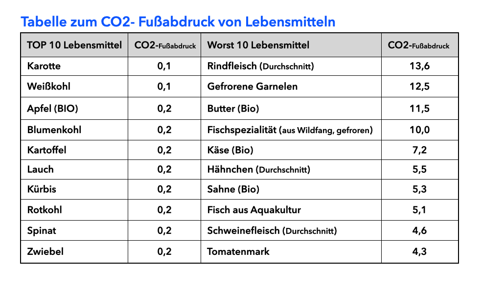 Für rund 200 Lebensmittel hat ein Team von Forschern des Heidelberger Instituts für Energie- und Umweltforschung im Jahr 2020 den jeweiligen CO2-Fußabdruck berechnet (www.ifeu.de).