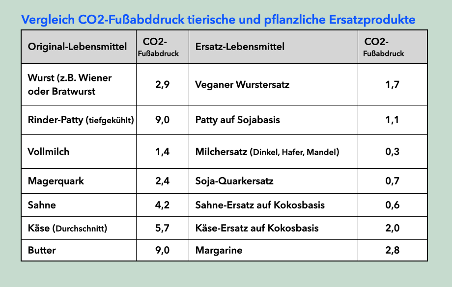 CO2-Fußabdruck tierische Original-Lebensmittel und pflanzliche Ersatzprodukte