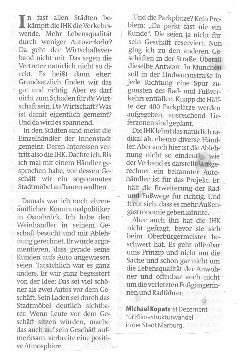 Immer wieder wird im Zusammenhang mit der Schaffung von Radfahrstreifen auf innerstädtischen Straßen vorgebracht, dass das Wegfallen von Parkplätzen für die anliegenden Geschäfte grundsätzlich von Nachteil sei. Ob das tatsächlich immer der Fall ist, sollte kritisch geprüft werden.